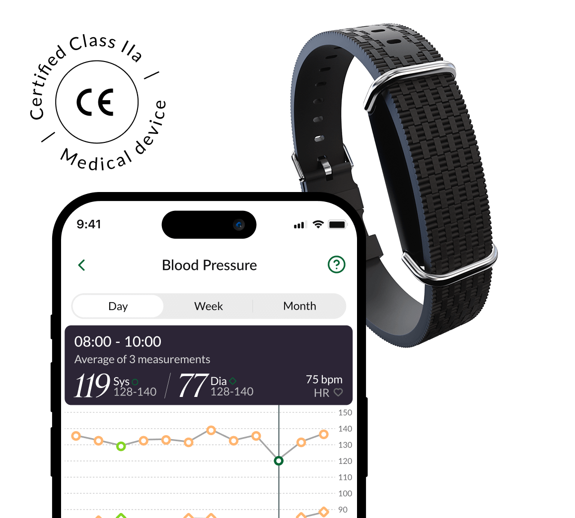 Validé cliniquement pour offrir une précision médicale comparable à un tensiomètre à brassard traditionnel, soutenu par de multiples études cliniques et certifié CE en tant que qu’appareil médical.