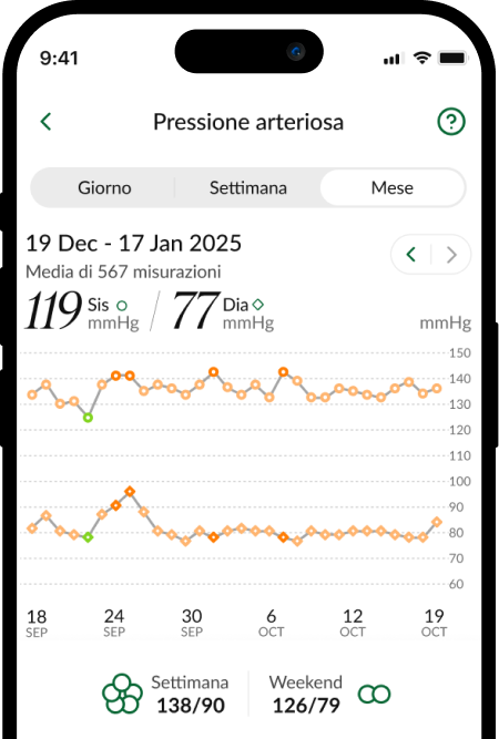 Monitora la tua pressione in modo semplice generando oltre 800 misurazioni al mese per ottenere dati specifici sulla tua salute da condividere con le persone a te care o con il tuo medico.