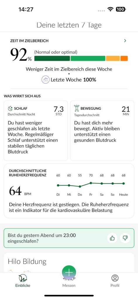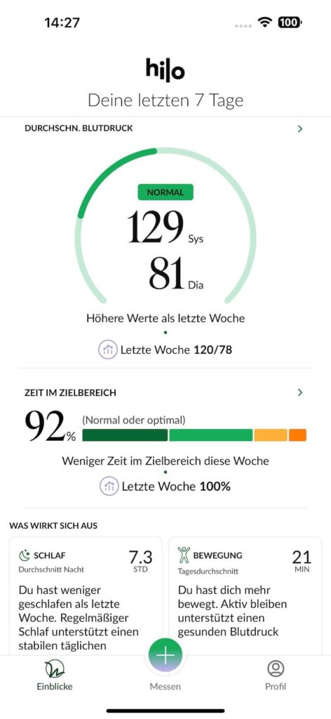 Bei Hilo arbeiten wir kontinuierlich daran, unsere App und die Dateninterpretation zu verbessern. In Version 2.6.0 machen wir es Mitgliedern noch leichter, ihren Blutdruckstatus auf einen Blick zu verstehen, Fortschritte Woche für Woche zu verfolgen und tägliche Gewohnheiten mit Messergebnissen zu verknüpfen. Zudem haben wir die Nutzererfahrung vereinfacht und liefern reichhaltigere Dateneinblicke in leicht verständlicher Form. Anders als Wellness‑Funktionen bei Konkurrenzgeräten liefert das Hilo Band klinisch validierte Blutdruckdaten, auf die du – und deine Ärztin/dein Arzt – vertrauen könnt.