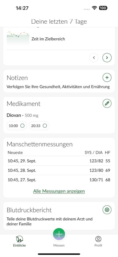 Die Funktion „Zeit im Zielbereich“ war früher den Abonnenten vorbehalten, steht jetzt aber allen Nutzer:innen offen. Hervorgehobene Kennzahlen zeigen, wie lange dein Blutdruck im gesunden Bereich bleibt – inklusive einer Erinnerung an deine Idealwerte. Farblich codierte Datenpunkte machen Ausschläge nach oben oder unten leicht erkennbar.