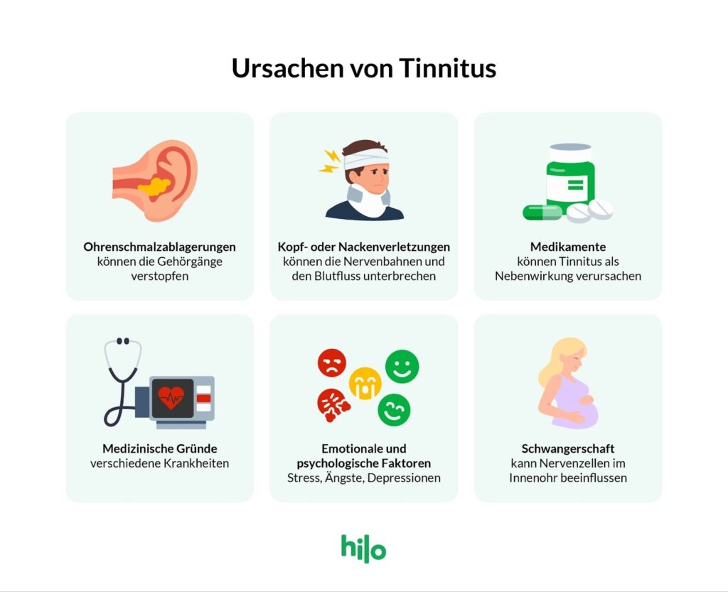 - Emotionale und psychologische Faktoren: Stress, Ängste und Depressionen können Tinnitus entweder auslösen oder verstärken.