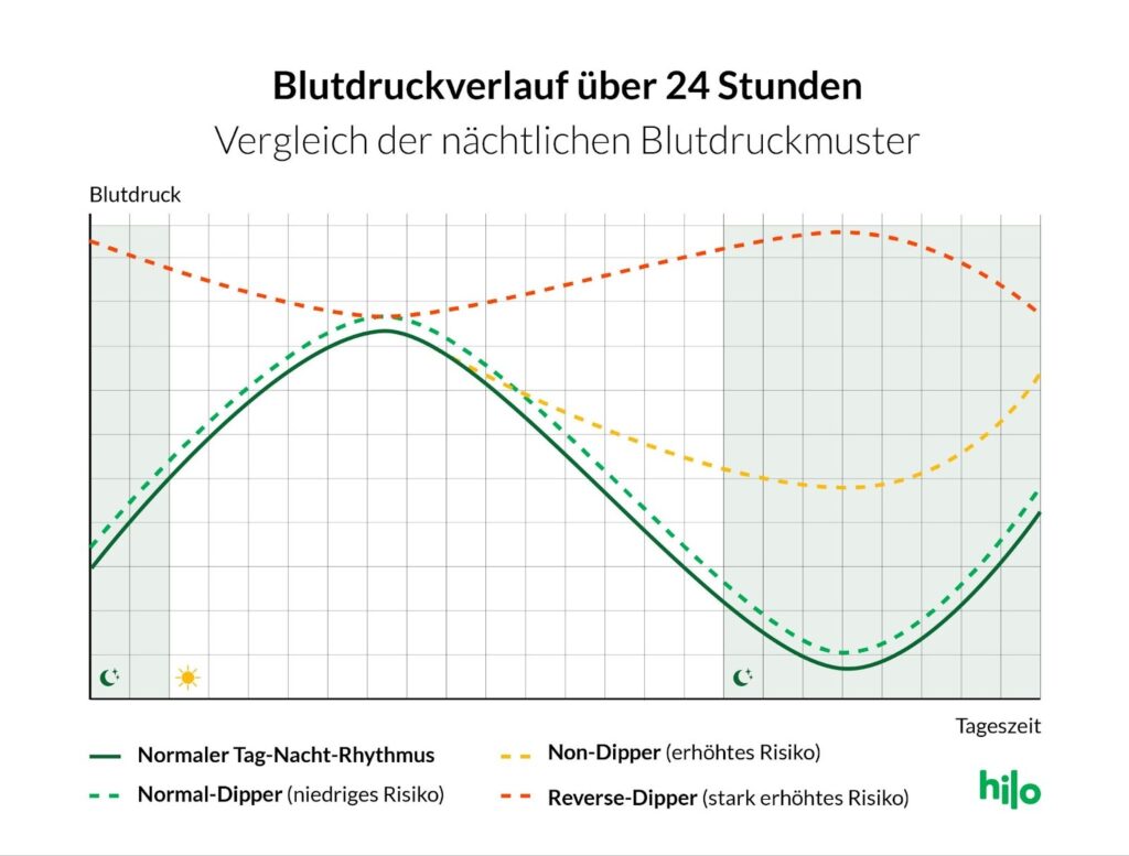 Steigt der Blutdruck nachts im Vergleich zum Tagesdurchschnitt sogar an, spricht man von umgekehrtem Dippen oder “Reverse Dipping”.