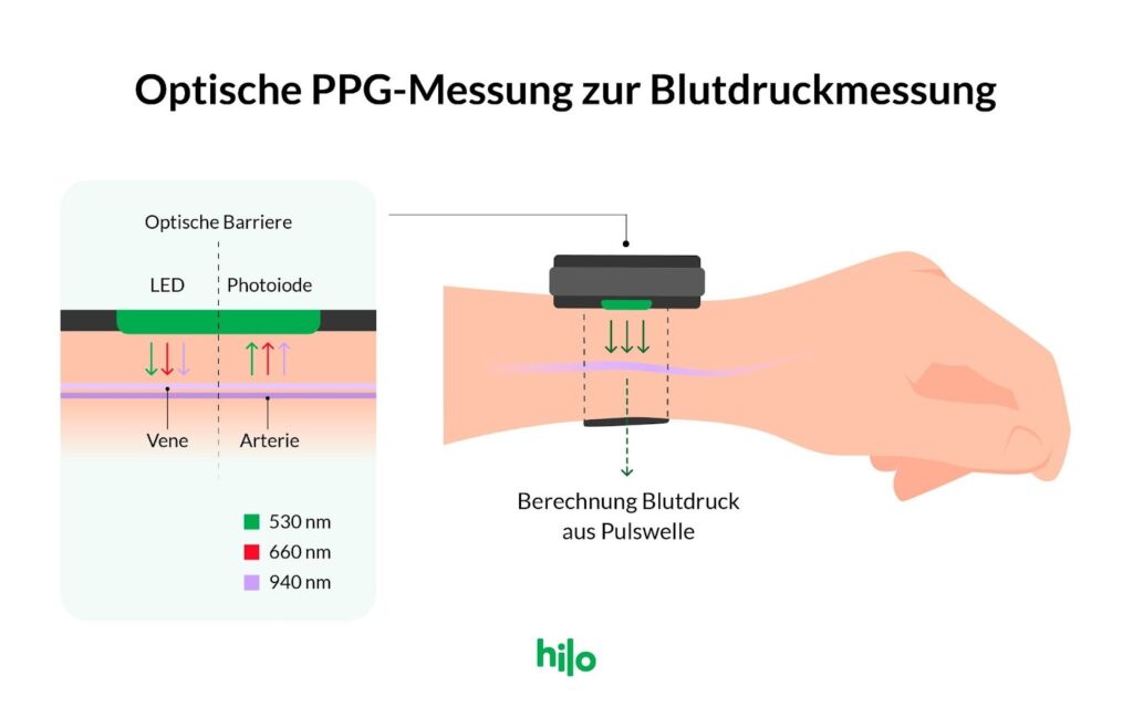 | Messtechnologie | Optische Blutdruckmessung (OBPM®) mit Pulswellenanalyse | PPG-Sensoren mit algorithmischer Schätzung |
