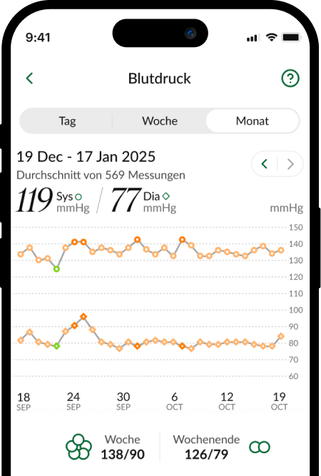 Behalte deinen Blutdruck jederzeit im Blick – dank über 800 automatischen Messungen pro Monat. Die personalisierten Einblicke kannst du per App mit Angehörigen oder deinem Arzt/deiner Ärztin teilen.