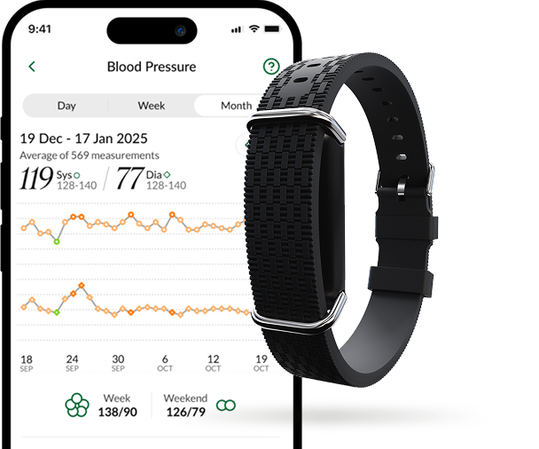 Hilo medical-grade wearable band – Designed for continuous blood pressure monitoring throughout the day and night.